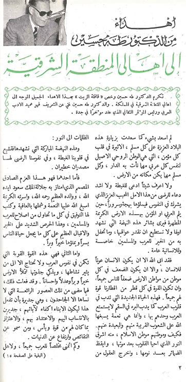 تكرّم الدكتور طه حسين، رئيس المؤتمر الثقافي العربي التاسع، الذي انعقد في جدة بتاريخ 21 جمادى الأولى سنة 1374هـ، وخص مجلة “قافلة الزيت” في العدد السادس (شعبان 1374هـ ، أبريل 1955م) بإهداء جميل موجّه إلى أهالي المنطقة الشرقية في المملكة وذلك بمناسبة زيارة أعضاء الوفود العربية المشتركة في المؤتمر إلى المنطقة. وقد نشرت تفاصيل هذه الزيارة، في عدد (رجب 1374هـ ، مارس 1955م).