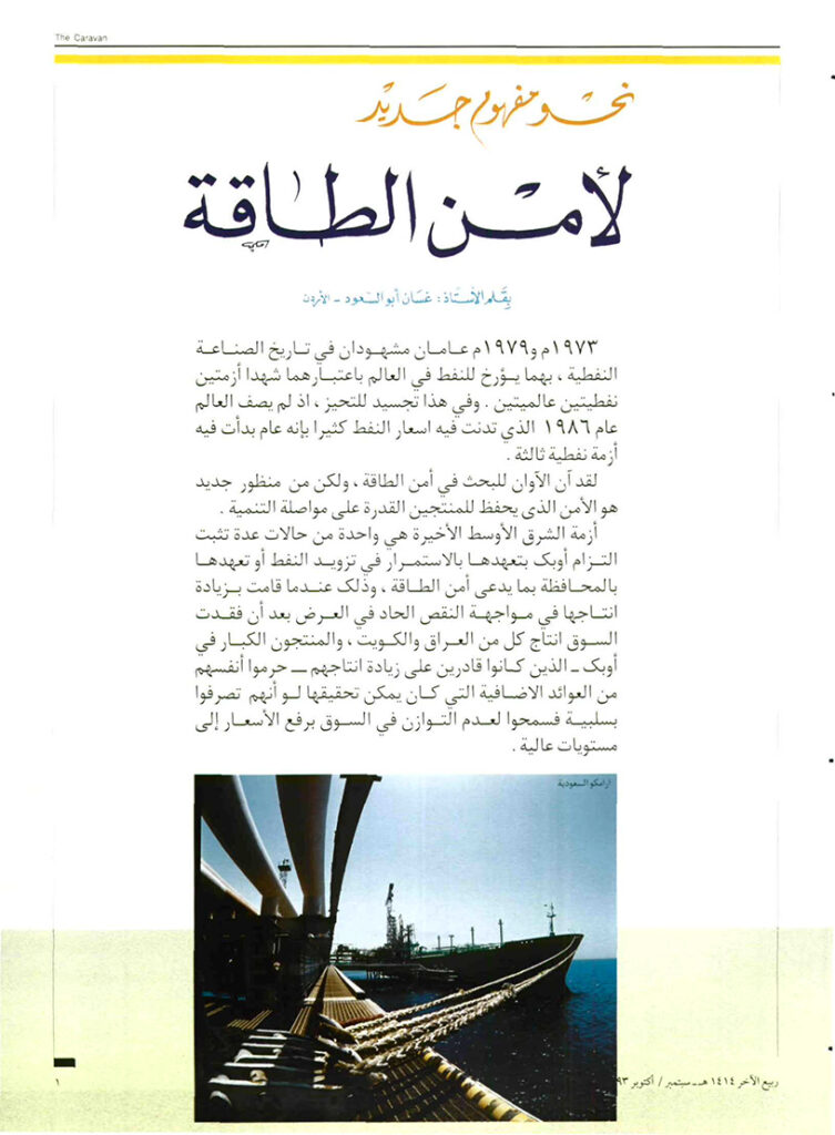كان عدد صفر 1410هـ (سبتمبر 1989م) القطرة الأولى من القافلة التي تهطل مذيَّلة باسم الخالد رئيسًا للتحرير، حيث تصدّرت الغلاف صورة لملعب الملك فهد الدولي، الذي استطلعه العدد بالتزامن مع استضافة المملكة لبطولة كأس العالم الخامسة للشباب لكرة القدم. وتضمَّنت الصفحات أيضًا قصيدتين شعريتين، وتقريرًا سنويًا عن منع الخسائر في أرامكو السعودية، إلى جانب موضوع عن الشاعر والكاتب المصري أحمد رامي، الذي غنَّت له أم كلثوم عشرات الأغاني، وكانت له عدة ترجمات بينها ترجمة لرباعيات الخيام.