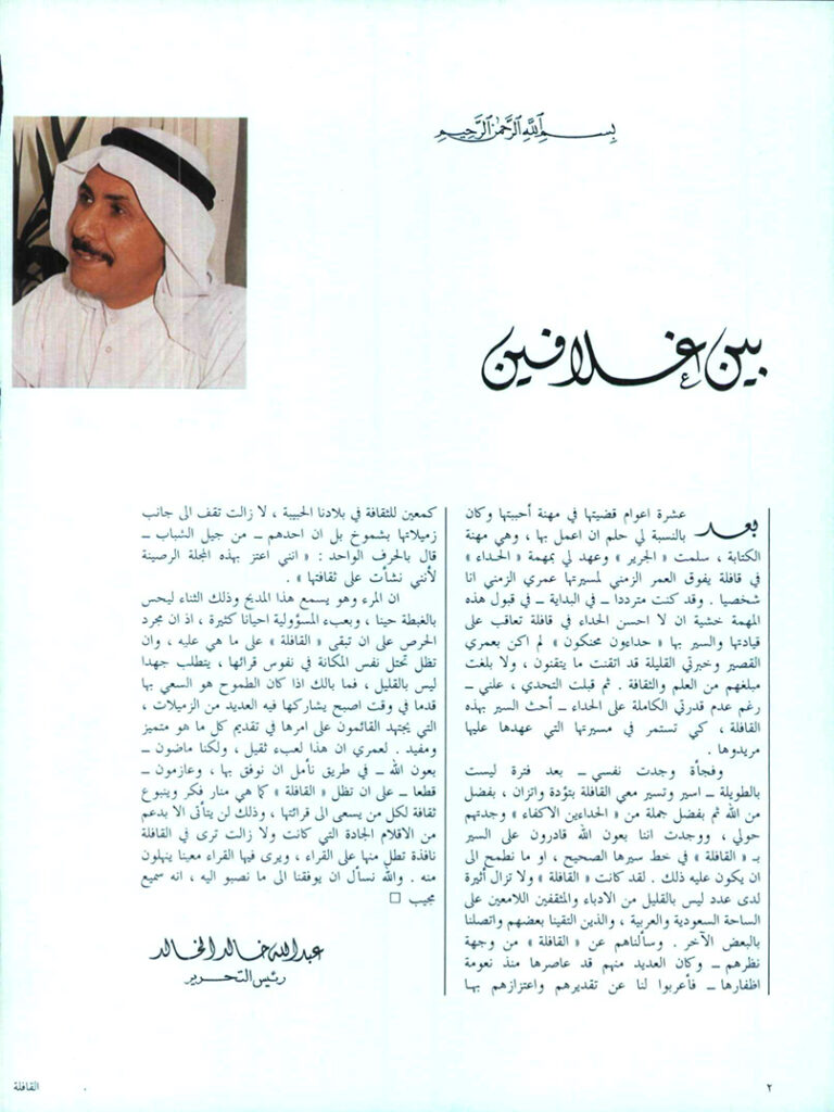 وإذا كان عقدٌ من الزمان عصيًّا على الاختصار في بضعة سطور، فإننا نكِل جزءًا من هذه المهمة الصعبة إلى الخالد نفسه؛ ففي عددها الخاص الصادر في صفر 1412هـ (أغسطس/سبتمبر 1991م)، احتفت القافلة بمناسبة مرور 40 عامًا على صدورها، وقد تضمَّن ذلك العدد مقالة افتتاحية له بعنوان “بين غلافين”، تحدّث فيها عن جانب من بدايات تجربته في رئاسة التحرير. يقول الخالد بنَفَس يشفّ عن تواضع جمّ، كما يكشف عن تقدير بالغ للمهمة التي أقبل عليها: “كنت متردّدًا في البداية في قبول هذه المهمة خشية ألا أُحسن الحِداء، في قافلة تعاقب على قيادتها والسير بها حدّاءون محنكون، لم أكن بعمري القصير وخبرتي القليلة قد أتقنت ما يتقنون، ولا بلغت مبلغهم من العلم والثقافة”.
