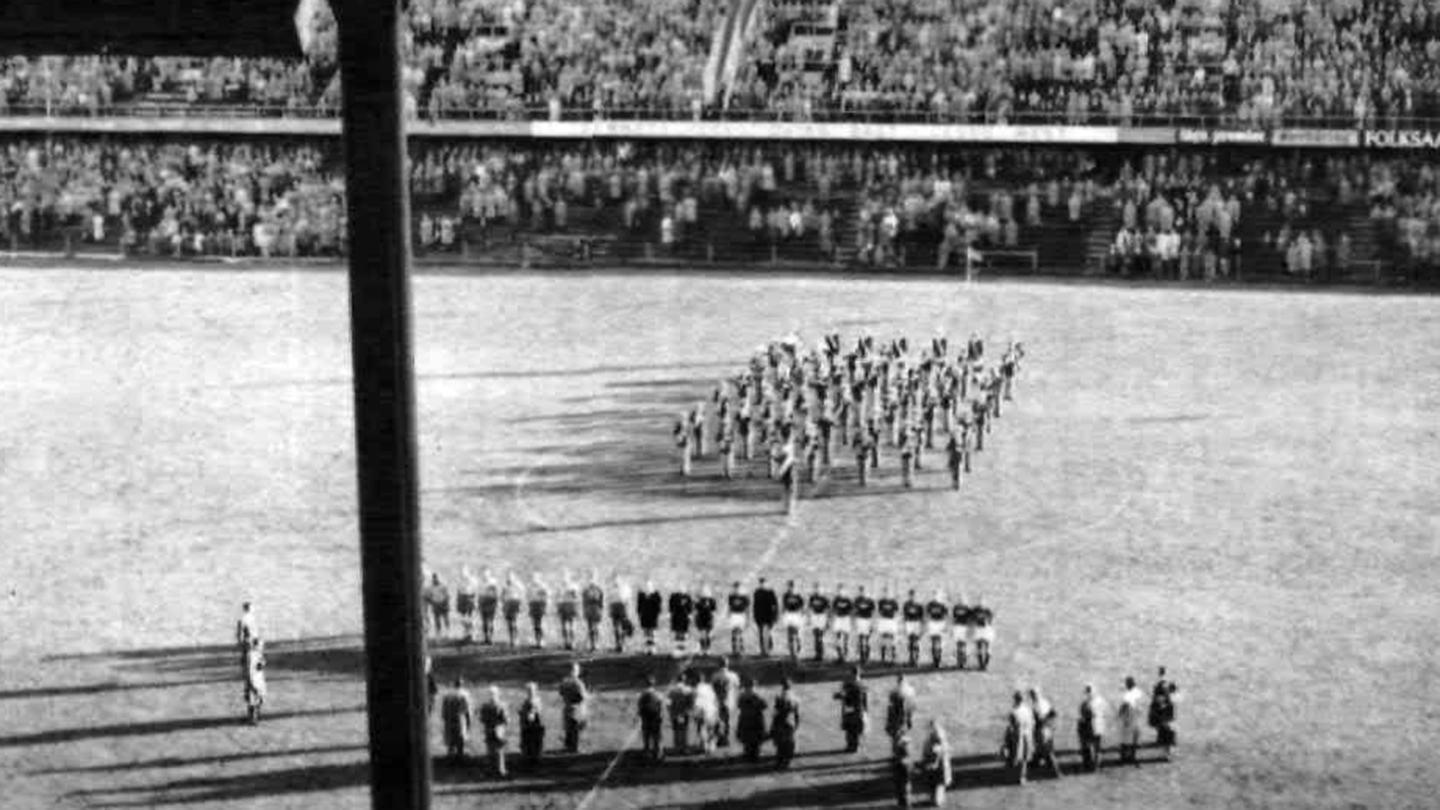جرت العادة في المباريات الدولية على عزف النشيد الوطني لكل من الفريقين المتباريين قبيل بدء المباراة .وتبدو في وسط الصورة إحدى الفرق الموسيقية وهي تعزف النشيد، بينما اصطف أعضاء الفريقين أمامها ووقف جمهور المتفرجين في أماكنهم تحية لهم.
