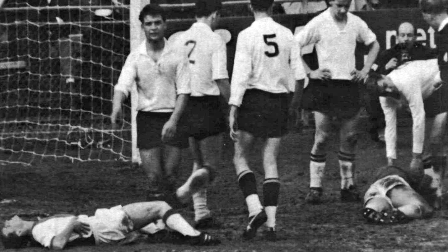 اثنان من اللاعبين في احدى مباريات كرة القدم في أوروبا وقد سقطا على الأرض ضحية الخشونة التي تسود أرض الملعب في أغلب الأحيان.