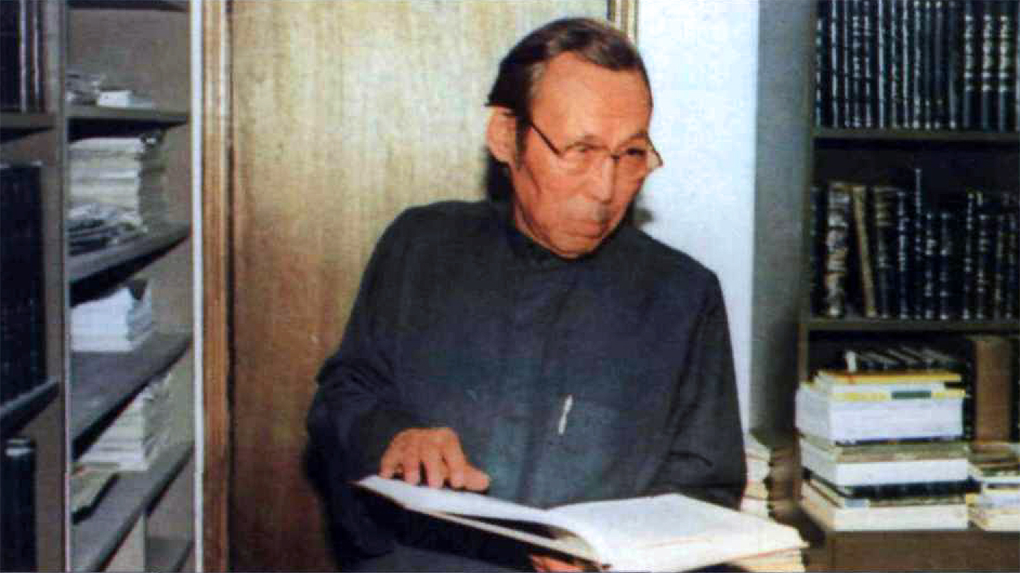 عزيز ضياء في مكتبته الشخصية في السبعينات الميلادية.