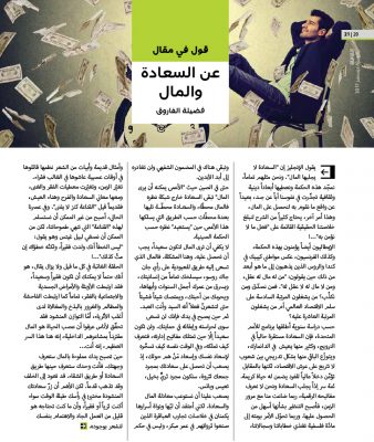 أما المال فلكي يكون مصدراً للسعادة يجب أن يكون صالحاً، أي مصدره حلال، وينفق في صلاح لمساعدة المحتاجين في بقاع الأرض، يطعمهم ويكسوهم ويعالجهم ويوفر لهم سكناً يحميهم من البرد والحر…
