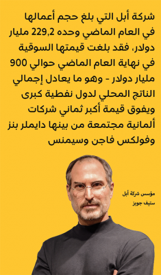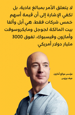 فمؤسس موقع “أمازون” جيف بيزوس يمتلك ثروة تفوق قيمتها 119,4 مليار دولار، وهو ما يزيد على إجمالي الناتج القومي في دول كثيرة. أما مؤسس “مايكروسوفت” بيل جيتس الذي ظل متربعاً على قمة هذه القائمة 15 سنة، ثم تراجع إلى المرتبة الثانية، فتقدّر ثروته بمبلغ 91 مليار دولار. وبلغ حجم أعمال شركة “أبل” في العام الماضي وحده 229,2 مليار دولار، وبلغت قيمتها السوقية حوالي 900 مليار دولار. وهو ما يعادل إجمالي الناتج المحلي لدول نفطية كبرى ويفوق قيمة أكبر ثماني شركات ألمانية مجتمعة من بينها “دايملر بنز” و”فولكس فاجن” و”سيمنس”.