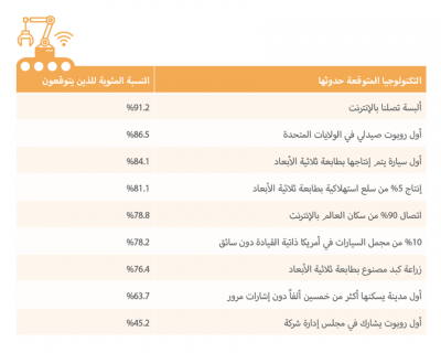 في استطلاعٍ أجراه المنتدى الاقتصادي العالمي مع 800 من المديرين التقنيين والخبراء في تكنولوجيا المعلومات والاتصالات عام 2016م، حول التكنولوجيات التي ستشكِّل نقطة تحوِّلٍ متوقعٌ حدوثها بحلول سنة 2025م تبيَّن أن: