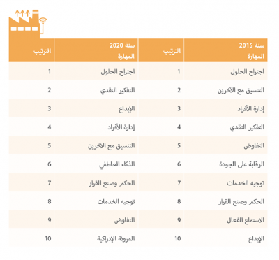 في دراسة للمنتدى الاقتصادي العالمي حول التغير في الطلب على عشر مهاراتٍ أساسيةٍ بين واقعها عام2015م وبين المتوقع لعام 2020م، تبين التالي: