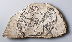 في جزء من بردية ترجع إلى عام 1150 قبل الميلاد، نرى قطة ترعى سرباً من الأوز وثعلباً يُعنى بقطيع من الماعز. وعلى قطعة من الفخار، من دير المدينة يرجع تاريخها إلى السنة نفسها، نرى قطة تؤدِّي دور خادمة تروِّح عن سيدتها المرسومة على هيئة فأر ممسكة بزهرة اللوتس، وفي قطعة أخرى نرى قطة تضطلع بدور مربية لفأر طفل ملفوف بحمالة، تحتضنه بحنان.