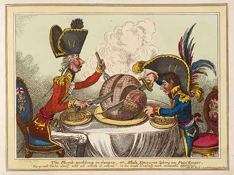وعلى الضفة الأخرى من القناة الإنجليزية مقابل فرنسا، أبدع جيمس جيلري (1757 – 1815م) رسام الكاريكاتير والطباعة الفنية الإنجليزي مجموعة هائلة من الرسومات بين عامي 1792 و1810م، متعلقة بالقضايا السياسية والهجاء الاجتماعي، حتى سمي “أبو الكاريكاتير السياسي”. فقد هجا في أعماله الملوك والوزراء والقادة العسكريين وحظيت رسومه بشعبية كبيرة، فكان الناس يتزاحمون على محلات بيع الكتب للحصول على الطبعات الأولى لرسومه؛ خاصة تلك التي تتناول الصراع التاريخي بين بلاده وبين فرنسا. فقد صور نابليون كقزم وصور جوزفين كامرأة بذيئة وأشهر أعماله قاطبة تلك التي تحتفظ بها مكتبة الكونغرس، والمسماة “البودنج الكامل في خطر، أو الذوَّاقة الحُكوميُّون يتناولون عشاءً صغيراً”، وفيها يظهر الوزير البريطاني ويليام بت، مرتدياً ملابس عسكريَّة بريطانيَّة نموذجيَّة، وهو جالس إلى المائدة مع الإمبراطور الفرنسي نابليون بونابرت. كِلاهُما يبدو وهو يقتطع شريحةً كبيرةً من حلوى البودنج نُقشت عليها خريطةُ العالم. ويُلاحظ أنَّ شريحة بت أكبر بِكثير من شريحة نابليون. وفي التعليق كتب تعليقه الوصفي الساخر، والتاريخي: “الإمبراطور العتيد، وخصمه الوزير الإنجليزي، يخدمان نفسيهما، أحدهما يأخذ الأرض، والآخر يأخذ البحار. وفق اقتراحات الإمبراطور العتيد في سبيل التصالح مع إنجلترا في شهر يناير من عام 1805م”.