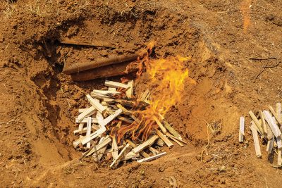 توضع الأخشاب وبقايا المخلفات النباتية في حفر عميقة يبلغ عمقها عدة أمتار ثم تشعل فيها النيران حتى تتوهَّج كامل الكتلة الحيوية في الحُفرة