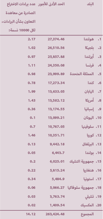 ويتضمن الجدول أدناه الحد الأدنى الفعلي للأجور في السنة مقوماً بالدولار 2017م يقابله عدد براءات الاختراع الصادرة عن معاهدة التعاون بشأن البراءات، لكل 10,000 نسمة: فهولندا مثلاً، الأعلى أجراً في العالم أصدرت عن طريق معاهدة التعاون بشأن البراءات، أكثر من براءتين لكل عشرة آلاف نسمة. بينما أصدرت المكسيك، الأقل أجراً براءة واحدة لكل نصف مليون نسمة: