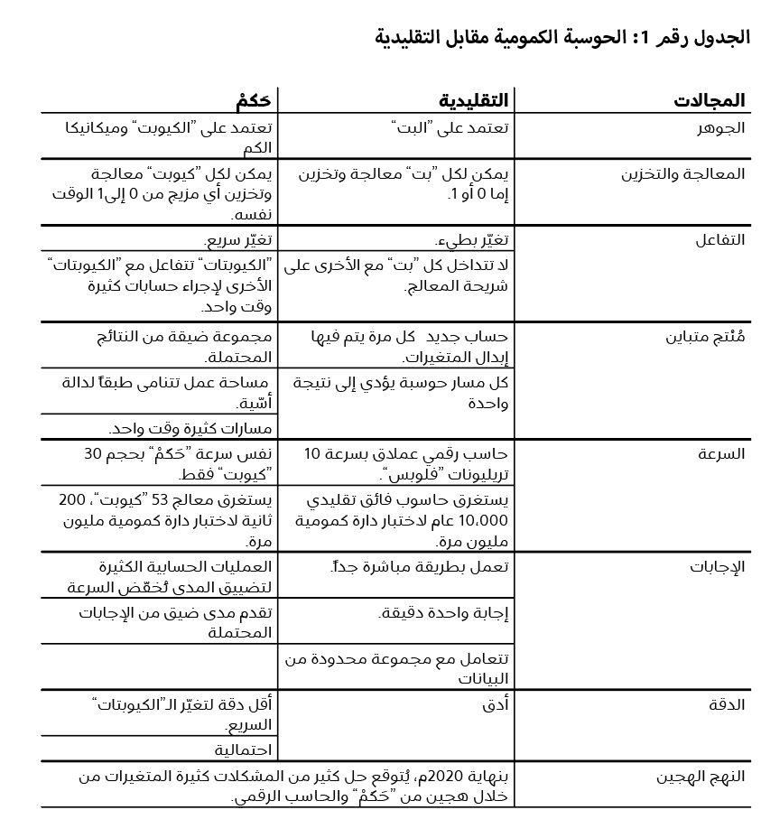 ويتميز “حَكَمْ” عن الحاسب التقليدي الرقمي في مجالات عديدة، الجدول (1). فمثلاً، يمكن أن يحتوي حاسب رقمي تقليدي حجمه 4 “بتات” على أي واحد من 16 رقماً (2^4) في أوقات مختلفة. بينما، توجد في “حَكَمْ” “كيوبِتات” تتراوح قيمتها من 0 إلى 1؛ وبالتالي، يوجد نظام كمّي لجميع الحالات الممكنة؛ فيمكن مثلاً أن يحتوي سجل “حَكَمْ” حجمه 4 “كيوبت” على 16 رقماً مختلفاً في وقت واحد. ونظرياً، يمكنه العمل وفقاً لكثير من القيم على التوازي، بحيث تصل سرعة “حَكَمْ” صغير بحجم 30 “كيوبت” فقط إلى 10 تريليونات “فلوبس” (FLOPS)، أي تقارب سرعة حاسب رقمي عملاق.