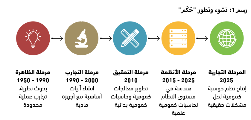مرَّت “حَكَمْ” بأربع مراحل حتى الآن من أصل خمس، وهي: مرحلة الظاهرة الفيزيائية، ثم التجارب، ثم التحقيق، ثم الأنظمة العملية، ثم المرحلة التجارية لحل مشكلات واقعية فيما بعد. الرسم (1).