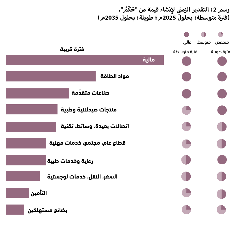 في المستقبل، ستكون “حَكَمْ” باهظة الثمن وبعدد قليل من اللاعبين الرئيسين. وتأمل الشركات مضاعفة قدرات “حَكَمْ”، حيث لوحظ تضاعف عدد الكيوبتات في معالج “حَكَمْ” كل 6 أشهر (بمعدل أسرع من قانون “مور” أربع مرات). ومن خلال التراكب والتشابك والتداخل الكمومي تنمو سرعة المعالجة طبقاً لدالة أسّية مع نمو عدد الكيوبتات، لكن ببطء. وتشير التقديرات إلى أنه بحلول 2030م، لن يوجد سوى 2000 إلى 5000 “حَكَمْ”. ومع ذلك، أطلقت “أمازون” و”ميكروسوفت” حديثاً، خدمات سحابية كمومية على الويب. وخلال الفترة الممتدة من 2022م وحتى 2026م، يُتوقع أن تتبع الشركات الأسلوب الهجين؛ وتصبح “حَكَمْ” قوية بما يكفي لبدء محاكاة ذات مغزى للهياكل الجزيئية للمواد الكيميائية والصيدلانية. لكن قد يتأخر نضج الذكاء الاصطناعي الكمومي. وبحلول منتصف الثلاثينيات من القرن الحالي، ستكون لدى مجموعة واسعة من الصناعات القدرة على إنشاء قيم كبيرة من “حَكَمْ”، الرسم (2).