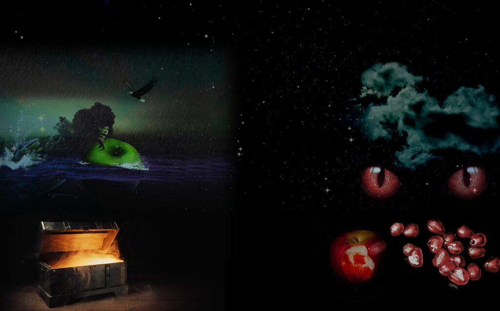 وبوسع حبات الرمان أن تتحوَّل إلى وحوش تتصارع. ففي حكاية الصعلوك الثاني ـ ضمن قصة الحمَّال والبنات ـ يحكي أن الرجل تعرَّض لسحر عفريت مسخه قرداً، ولكنه ظل محتفظاً بعلمه وحسن خطه..