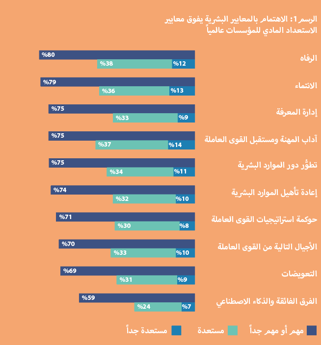 يحقِّق رأس المال الاجتماعي اكتشافاً جديداً ينافس رأس المال المادي في القيمة. فقد صنّف %65 من الرؤساء التنفيذيين “النمو الشامل inclusive growth” ضمن أفضل ثلاث استراتيجيات جللة (أكثر من ثلاث مرَّات من نسبة “قيمة المساهم”). وبيَّنت المسوح، أن الاهتمام بالمعايير البشرية يفوق الاهتمام بمعايير الاستعداد المادي للمؤسسات، الرسم (1). ويلاحظ أن هذه المعايير الأكثر أهمية تتمحور حول رأس المال البشري غير الملموس، مثل:
