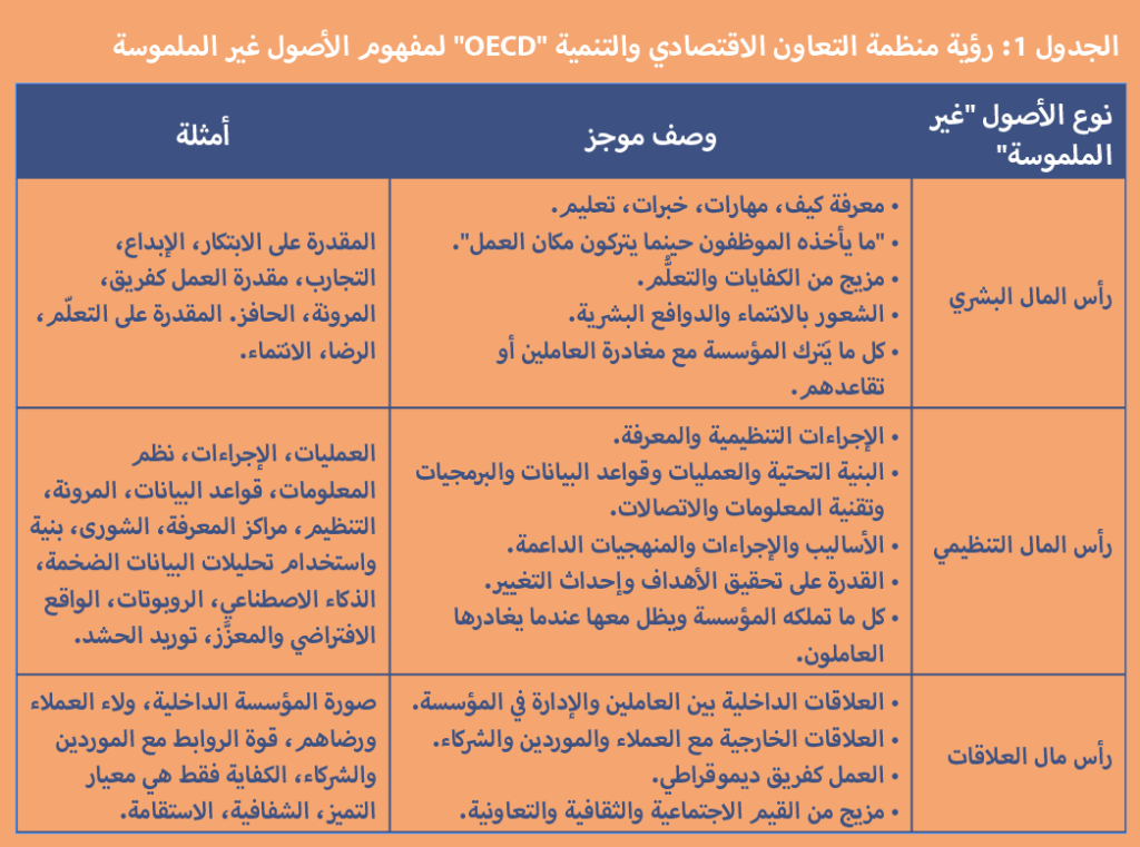 ويمكن النظر إلى الأصول “غير الملموسة” كمجموع أنواع ثلاثة: (رأس المال البشري) + (رأس مال العلاقات) + (رأس المال التنظيمي)؛ أو أنها مجموع ما يعرفه الموظفون ويمنح المؤسسة ميزة تنافسية على الآخرين. وقدرة منظمة التعاون الاقتصادي والتنمية OECD وصف ثلاثة أنواع من الأصول غير الملموسة، (الجدول 1).