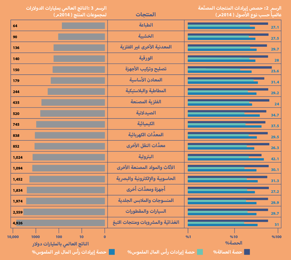 فقد بلغ متوسط حصة الأصول غير الملموسة (ومن بينها الملكية الفكرية والتقنية والتوسيم) %30.4 من الدخل الناجم عن عوامل الإنتاج الثلاثة خلال الفترة 2000م – 2014م، أي قرابة ضعفي حصة الأصول الملموسة (الآلات والمباني والمخازن والمركبات) والعمالة (أجور وتعويضات العاملين)، ومما يثير الاهتمام أن هذه الحصة ارتفعت من %27.8 في عام 2000م إلى %31.9 في عام 2007م، لكنها استقرت بعدها. وإجمالاً، ارتفع الدخل المتأتي من الأصول غير الملموسة في 19 قطاع تصنيع بنسبة %75 في الفترة نفسها، وبلغ 5.9 تريليون دولار عام 2014م. وقد يفسَّر ارتفاع حصة الأصول غير الملموسة باستفادة شركات التصنيع العالمية من تزايد فرص ترحيل الأنشطة التي تتطلب أيادي عاملة كثيفة إلى الاقتصادات ذات الأجور المتدنية.