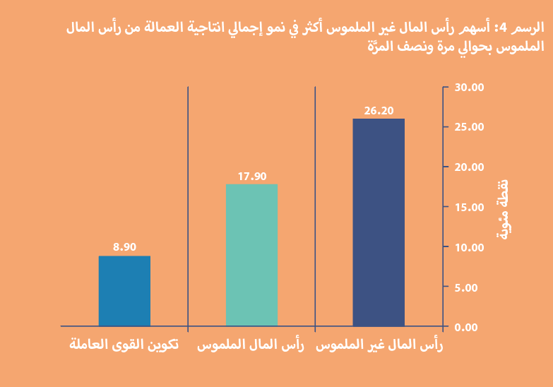 وتلعب الأصول غير الملموسة دوراً مهماً في نجاح الشركات والمؤسسات في تحقيق غاياتها، بل يمكن أن تَفيض آثاراً جانبية على قطاعات أخرى من الاقتصاد. والواقع أن هذه الآثار الجانبية من الاستثمار في الأصول غير الملموسة موجودة على كل المستويات، مثل: الجدارة الاقتصادية، ورأس المال البشري بمقدار كبير، وغالباً ما تتجاوز آثارها المباشرة. فمثلاً، تشير دراسات تجريبية في كندا إلى أن الاستثمار في الأصول غير الملموسة عنصر مهم في نمو إجمالي إنتاجية العمالة، حيث بلغ إسهام رأس المال غير المادي في المتوسط 26.2 نقطة مئوية في إجمالي نمو إنتاجية العمالة، في حين أسهم رأس المال المادي %17.9 نقطة مئوية، وأسهم تكوين القوى العاملة %8.7 نقطة مئوية، (الرسم 4). وأسهم الابتكار أكثر من جميع فئات رأس المال غير المادي، تليها الكفايات الاقتصادية والمعلومات المحوسبة. وكان هناك اتجاه مشابه في الولايات المتحدة وأوروبا وأستراليا.