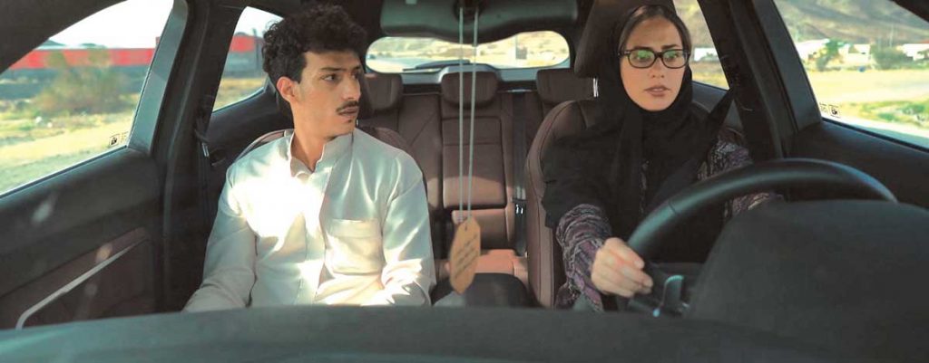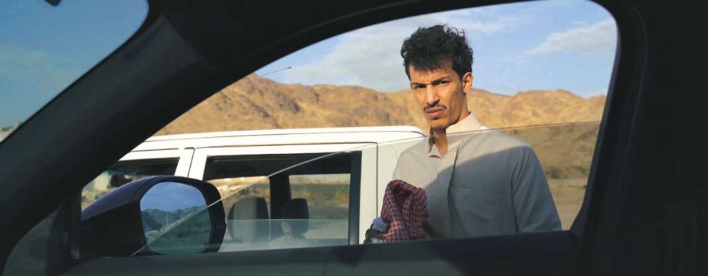 ثم في لقطة داخل السيارة، حيث ستدور أحداث الفلم، تأخذنا الكاميرا في لقطة مقرَّبة إلى بيت شعر من قصيدة محمود درويش “فكِّر بغيرك”، منقوش على قطعة خشبية صغيرة ومعلَّق بمرآة السيارة: “وأنت تعود إلى البيت بيتك فكِّر بغيرك، لا تنس شعب الخيام”. ثم في لقطة جوية تالية، نرى البطلة “رزان” تقود سيارتها على طريقٍ ريفي، ثم تتوقف بجانب سيارة البطل “عودة” المعطلة على جانب الطريق (الممثل وائل غبيش). وفي حوار مقتضب، يرفض البطل أن يركب، لتتركه ولكن في اللقطة التالية نرى البطل وقد اضطر للركوب معها لحاجته إلى إصلاح مولد الكهرباء في المدينة، لاعتماده التام عليه في بيته في قريته “الهامل” التي تبعد 150 كيلومتراً عن جدة. وما جدة هنا إلا رمزاً لكل المدن، والهامل رمز لحياة مختلفة وبسيطة.