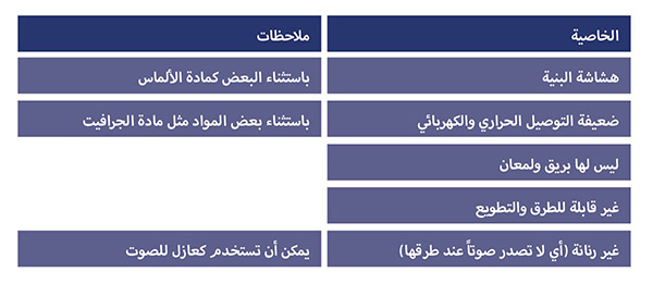 تتميز المواد اللامعدنية بمقاومتها العالية للتآكل الكيميائي. ويوضِّح الجدول التالي أهم خواص تلك المواد مقارنة بالمواد المعدنية: