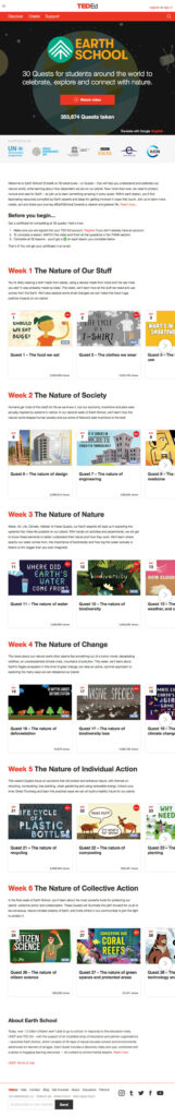 في مواجهة هذه الأزمة، برز تعاون غير مسبوق بين برنامج الأمم المتحدة للبيئة ومبادرة “تيد إيد” للشباب والتعليم مع خبراء من “ناشيونال جيوغرافيك” و”الصندوق العالمي للطبيعة” و”هيئة الإذاعة البريطانية”، لإيجاد منصة تعليمية مجانية عالية الجودة تساعد الطلاب وأولياء الأمور والمعلمين حول العالم، الموجودين حالياً في المنازل، لاستكشاف علوم كوكب الأرض وخصائصه الفريدة. وهكذا تم إطلاق “مدرسة الأرض” في تاريخ يحمل دلالات تتماشى مع روحية المبادرة وهو الذكرى الخمسين ليوم الأرض، أي في 22 أبريل 2020م، وذلك بإصدار فِلْم فيديو واحد يومياً، واستمر ذلك حتى “يوم البيئة العالمي” في 5 يونيو.
