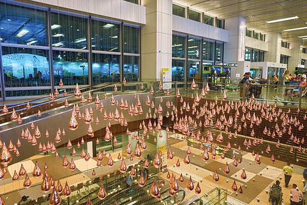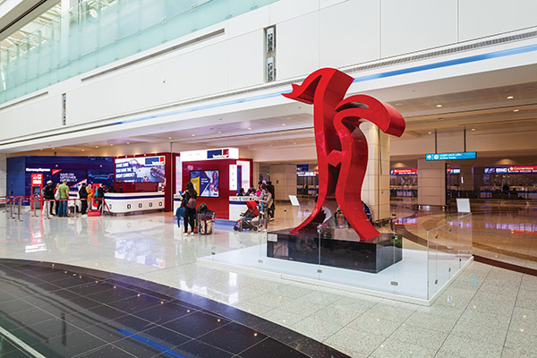المطار المثالي هو الذي يتم فيه إرشادنا إلى التنقل عبر أرجائه بشكل طبيعي. فعلى سبيل المثال، غالباً ما تختلف ألوان الإشارات وأشكالها من طرف إلى طرف، وتتغير أنماط الأرضيات، وتعمل القطع الفنية الكبيرة كعلامات مميَّزة للمواقع لسهولة التوجيه. فكثيراً ما نجد في مطارات عديدة مجسمات كبيرة، ولو كانت موضوعة هناك للعرض بشكل مؤقت، كمنحوتة كلمة “حب” بالخط العربي وباللون الأحمر، و”الدلة” المصنوعة بالكامل من الألياف الزجاجية الذهبية التي تمثل عرضاً تجريدياً للقهوة العربية من توقيع جمال حبروش السويدي الموجودتين في مطار دبي الدولي، ومجسم “إلى الأبد” المكوَّن من عدد كبير من الدرَّاجات الهوائية من توقيع الفنان الصيني آي ويوي في مطار أبو ظبي، ومجسم المطر الحركي المكوَّن من 608 قطرات مطر معلّقة ومصنوعة من الألومنيوم خفيف الوزن في مطار شانغي في سنغافورة، والتثبيت المذهل للصور البانورامية الرائعة من أعمال الفنان مارتن ليبشير في مطار فرانكفورت في ألمانيا.