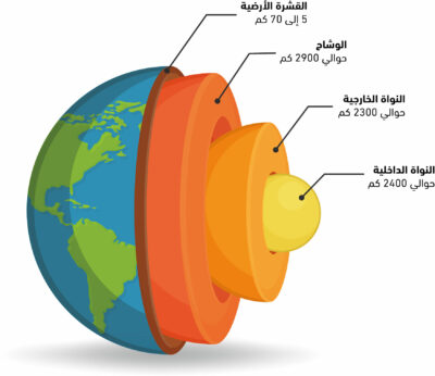 2 – طبقة الوشاح، التي تتوسط نواة الأرض والقشرة الخارجية الرقيقة، وسماكتها حوالي 2900 كيلومتر. وتتراوح حرارتها بين 200 درجة مئوية عند ملامستها القشرة و4000 درجة عند ملامستها النواة.