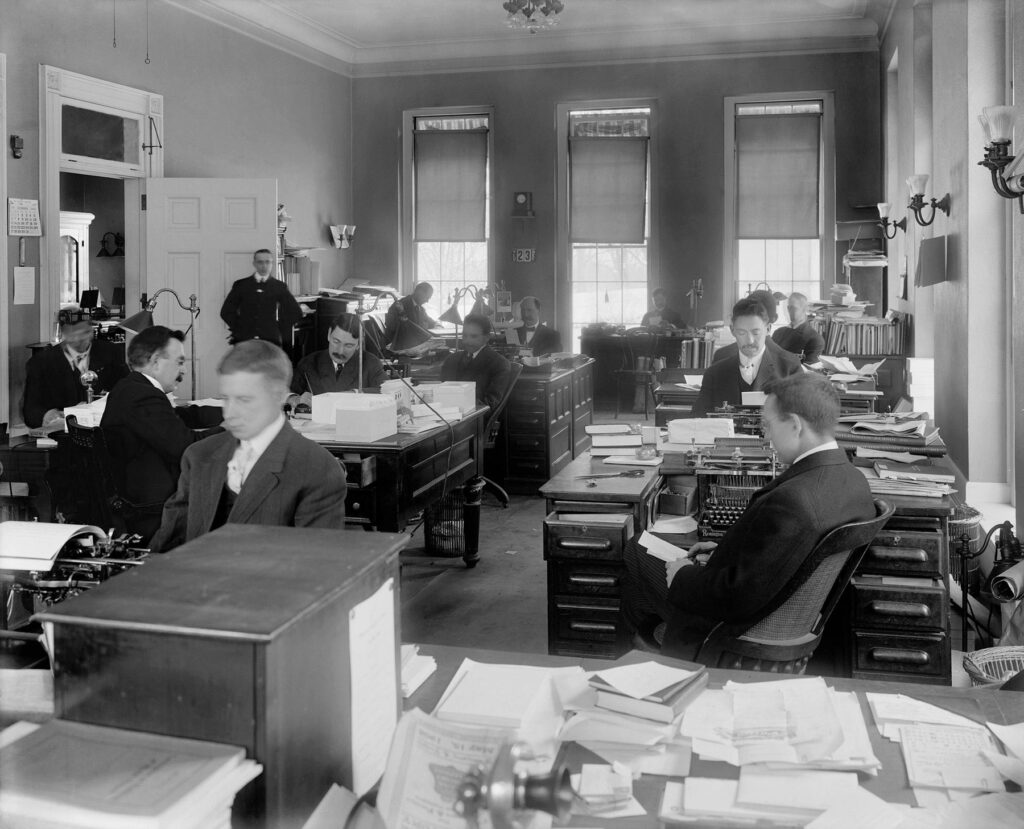 مع بداية القرن العشرين أدخل فرانك لويد رايت تصميم المكتب المفتوح في الولايات المتحدة. فكان المديرون العامون والمديرون التنفيذيون يجلسون في مكاتب واسعة تتوسط قاعات ذات نوافذ كبيرة، ومفتوحة على صفوف من مكاتب الموظفين والسكرتارية في المركز لتسهل عليهم المراقبة.