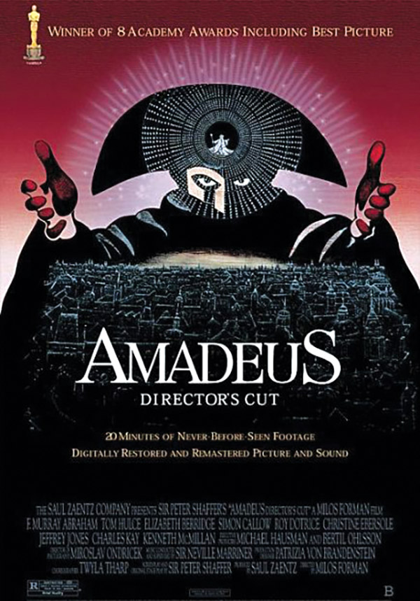 لأسباب فنية وموضوعية ومزاجية أضع فِلْم “أماديوس” (Amadeus) للمخرج تشيكي الأصل ميلوش فورمان على قائمة مفضلاتي السينمائية، لأنه يتحدَّث عن حقل يعنيني ويغوي حواسي على الدوام، وهو الموسيقى الكلاسيكية ممثلة في سيرة الموسيقار ولفغانغ أماديوس موزارت. وهو فِلْم لا يستعرض حياة هذا الفنان بشكل معلوماتي تراتبي جاف، بل يتعامل من موسيقاه التي أحبها كمادة خام للفلم. حيث يؤطر كل مرحلة حياتية وكل مشهد سينمائي بمقطوعة موسيقية، إما كجزء من متن الشريط السمع-بصري، أو كخلفية موسيقية دالّة وموطَّنة في الوجدان لروائع موزارت. الأمر الذي أضفى على الفلم سمة التشويق، إلى جانب التوثيق. والأهم أن الفلم الذي جمع فيه ميلوش فورمان ما بين صراحة الشاشة الشرقية وتقنيات الشاشة الغربية، تأسس على قيمة صراعية ما بين موزارت، الشاب المستهتر الموهوب، الذي أدى دوره بكفاءة توم هيلوك، وبين أنتونيو ساليري، موسيقار البلاط، الذي أدى دوره موراي أبراهام ببراعة لافتة.