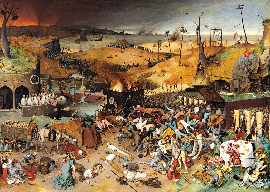 من جانب آخر، تُعدُّ لوحة “انتصار الموت” للفنان بيتر برويجل الأكبر، أحد أهم لوحات عصرها وأكثرها تمثيلاً لوباء “الطاعون الأسود”، جسَّدت مأساة الموت والخراب في صور مروعة في وحشيتها، صور ذات تعابير قاسية، حيث تتحلل الجثث وتعبث في مشهد حرب بين البشر وجيش من الهياكل العظمية كرمز للموت. والملاحظ أن لا أحد من البشر في هذا الحشد كانت لديه القدرة على الفرار، فالجميع كان تحت رحمة هذا الجيش الزاحف الذي يقود ضحاياه نحو وجهة حتمية وهي الموت. ويعدّ مشهد الموت من الخاصيات النادرة في الفن الإيطالي. فقد صرحت إحدى المقالات المنشورة في صحيفة (وول ستريت جورنال)، بأن “الوحشية في هذه اللوحة، تعطي لعمل برويجل أهمية حزينة مستمرة. وبدا كما لو أن برويجل طمس كل ملامح العصور الوسطى ليدمجها في لوحة واحدة. يمكننا أن نرى حرفياً مئات الرموز وأوصاف الحياة اليومية في اللوحة، تلعب كل منهم دوراً أخلاقياً صغيراً موضوعه الموت”.