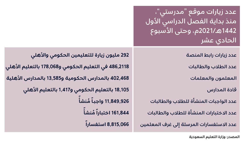 • منصة مدرستي: التي تتضمَّن حزماً واسعة من الأدوات التعليمية المساندة لتخطيط وتنفيذ العملية التعليمية عبر الفصول الافتراضية، إضافة إلى الواجبات والاختبارات وساحات النقاش والاستبيانات، والوسائط التعليمية المتنوِّعة، التي يعمل كثير منها في إطار تقنية الواقع المعزَّز.
