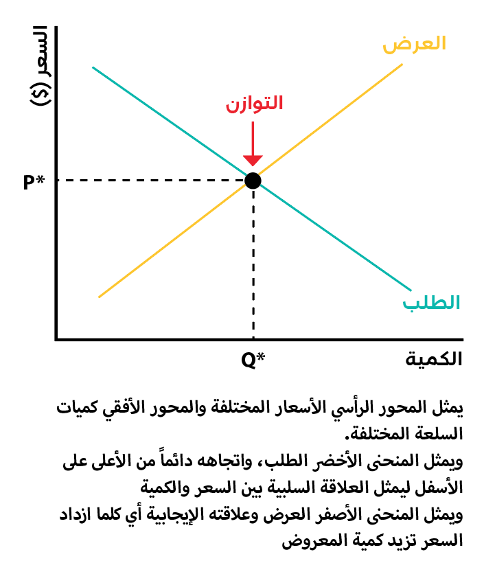 إن التفاعل بين هاتين الرغبتين في السوق ينتج عنه دائماً تقاطع عند كمية محدَّدة وسعر محدَّد يطلق عليهما في علم الاقتصاد سعر التوازن وكمية التوازن.