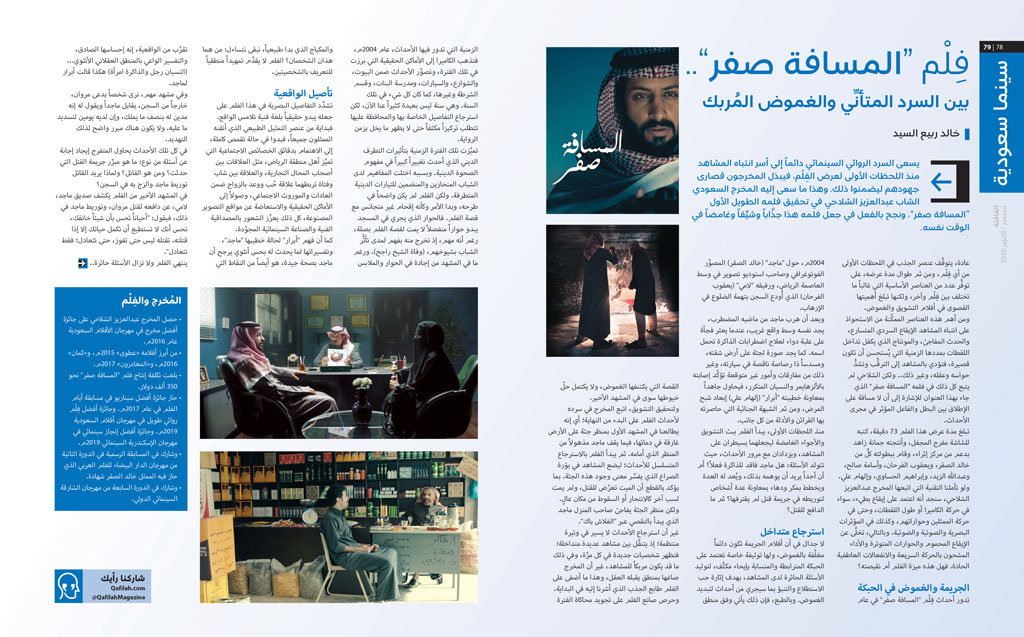 ومن بعض ردود الفعل وتعليقات القرّاء على الأعداد القليلة الماضية، ما جاءنا من الأخت رغدة منصور من جمهورية مصر العربية التي كتبت تمتدح السينما السعودية، في تعقيبها على المقالة التي تناولت فِلْم “المسافة صفر” في عدد سبتمبر/ أكتوبر 2020م. وقالت في رسالتها إنها تابعت بعض الأفلام السعودية القصيرة، ولكنها أُعجبت أكثر بالحوار والإخراج السينمائي في الفلم الطويل، و “إن السعودية تمتلك مواهب سينمائية شابة، استطاعت البروز خلال الفترة الماضية، وأثبتت نفسها على مستوى المهرجانات العربية والعالمية”.