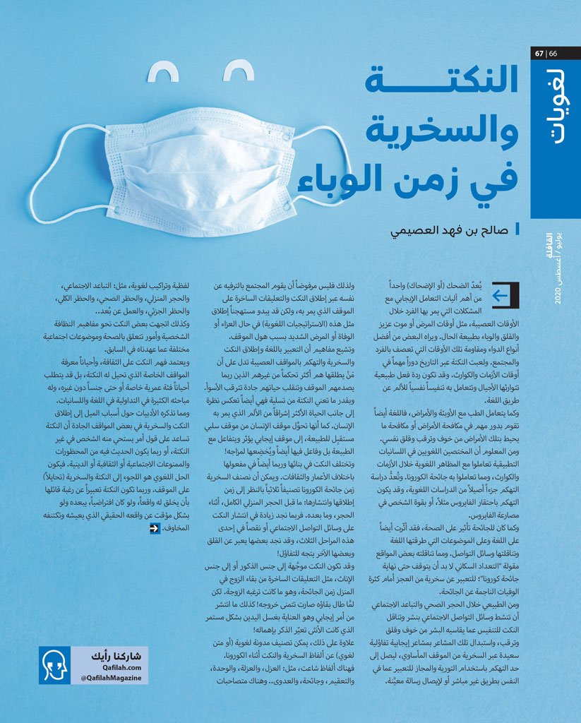 كما كتبت نوف العنيزان من الرياض تشكر المجلة على مقالة الدكتور صالح العصيمي في العدد نفسه، الذي تحدث فيه عن “النكتة في زمن الوباء”، قائلة إنها أصبحت ظاهرة عالمية وليست عربية فقط، حيث إن العالم أصبح في فترة الوباء يبحث عما يخرجه من دائرة الأخبار اليومية السوداوية التي تتناقلها وسائل الإعلام حول تفشي الجائحة على مستوى العالم.