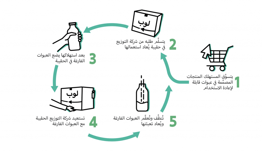 تعمل شركة لوب على توزيع المنتجات، من الشركات آنفة الذكر، للمستهلكين والمعبأة في عبوات قابلة لإعادة التدوير وموضَّبة في حقائب يُعاد استخدامها من قِبل المستهلكين ليضعوا فيها العبوات الفارغة، ومن ثم يتم أخذ الحقائب عن طريق خدمة توصيل البريد. يُصار بعد ذلك إلى تعقيمها، وإعادة تعبئتها، وإرسالها مرَّة أخرى. تقنية “نموذج بائع اللبن” تقنية قديمة جداً، أُعيد إحياؤها بطريقة مبتكرة، وأعطيت اسماً ووظيفة جديدة.