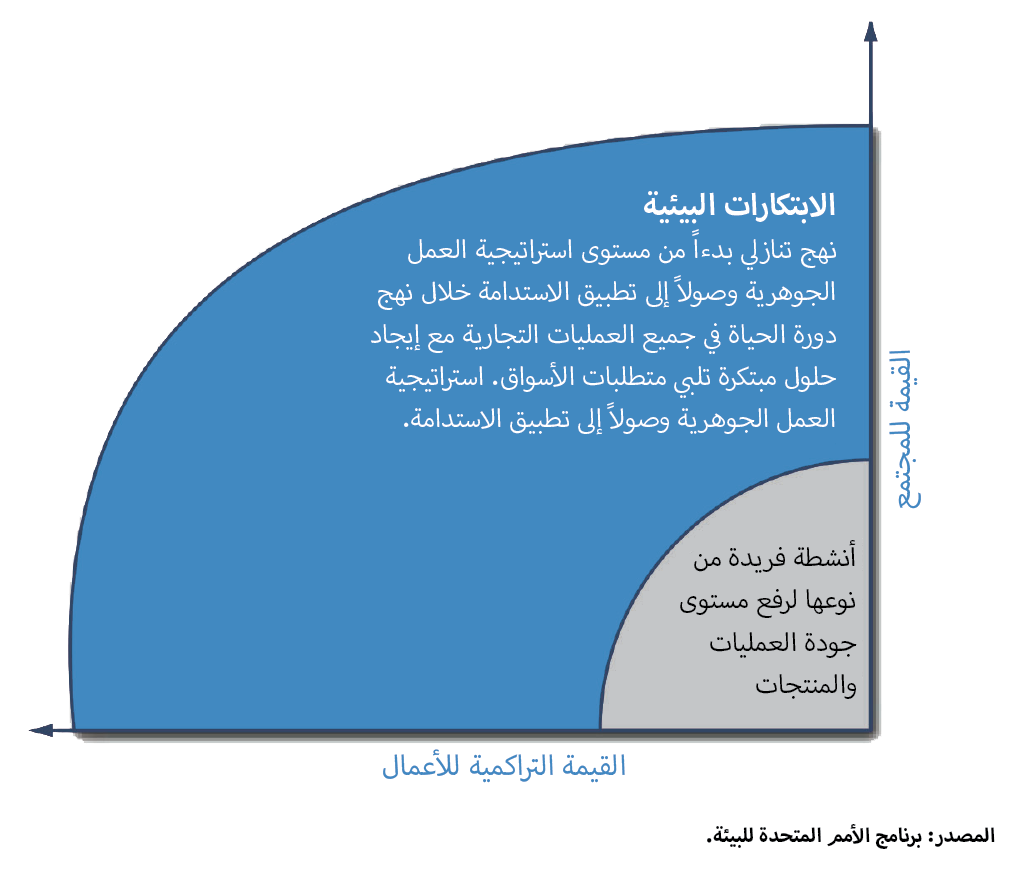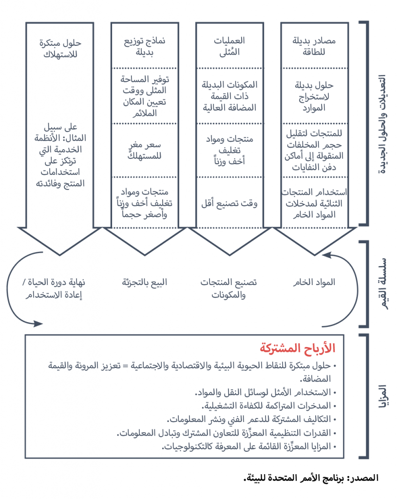 • المكتسبات من الابتكار الأخضر – تبدأ مكتسبات الابتكار الأخضر من مزايا بدائل الطاقة وتستمر على امتداد سلسلة القيمة: من استخراج مبتكر للمواد الأولية، وتصنيع المنتجات والمكونات، إلى البيع بالتجزئة، وانتهاءً بـدورة حياة السلعة. ثم يعاد استخدامها في دورة جديدة، حيث يتحقَّق بذلك الاقتصاد الدائري.