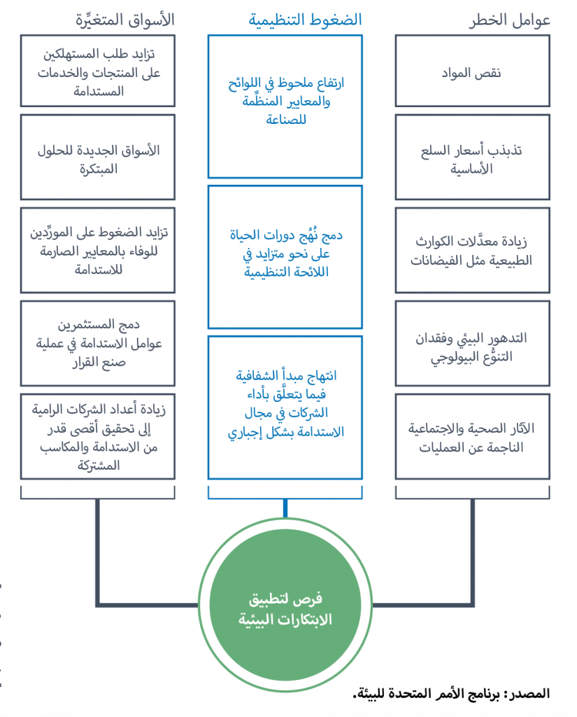• كما تخلق الضغوط المتزايدة على الأعمال التجارية، نتيجة الأزمات المتعدِّدة، ظروفاً ملائمة للابتكارات الخضراء، كما يظهر في الشرح أدناه.