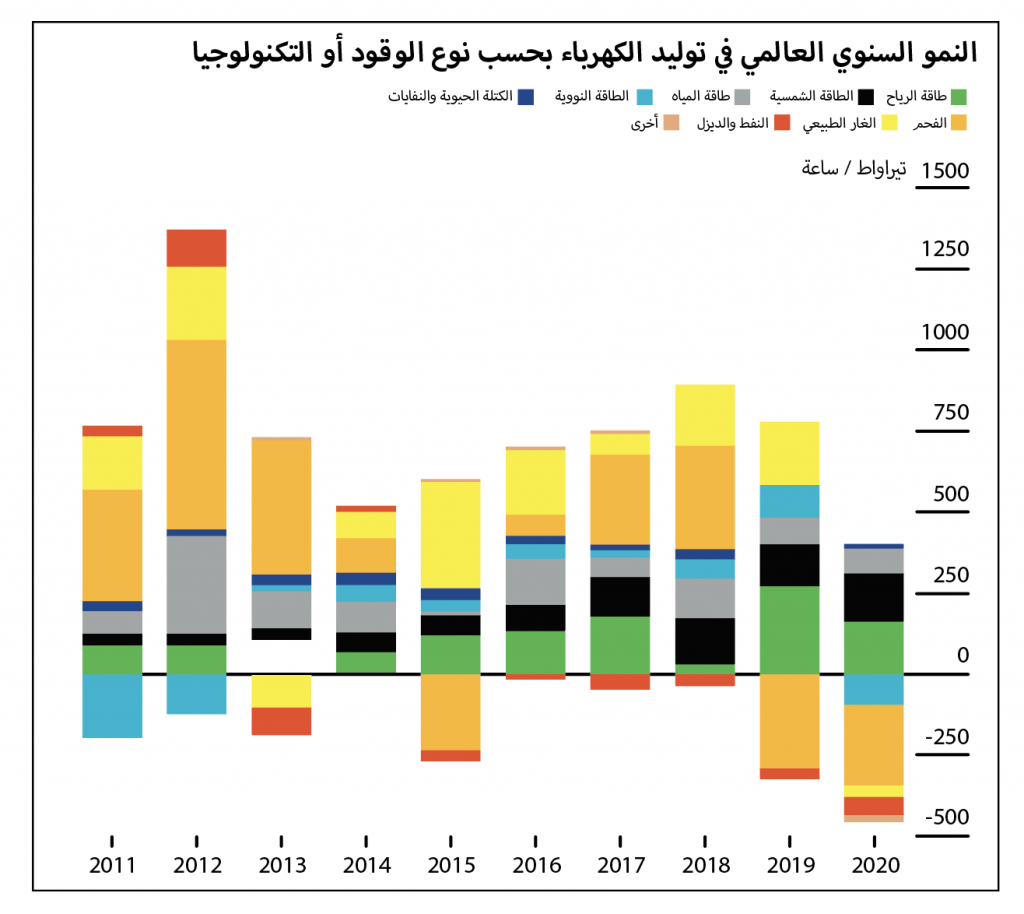 - اعتُبرت، على سبيل المثال، الفترة الأخيرة بين 2020-2021م سنوات ديناميكية بالنسبة لقطاع الكهرباء على مستوى العالم. فعلى الرغم من انخفاض الطلب على الطاقة جرَّاء وباء كوفيد – 19، إذ هبط معدَّل توليد الكهرباء العالمي بنسبة %20 خلال عام 2020م بأكمله، وتراجعت الكهرباء المولدة من الفحم والغاز، ومن الطاقة النووية جميعها على أساس سنوي، حقَّقت مصادر الطاقة المتجدِّدة نجاحاً، حيث كانت المصدر الوحيد الذي سجَّل نمواً على صعيد توليد الكهرباء خلال السنة الماضية. إن الطاقة المتجدِّدة تحقِّق مكاسب هائلة في قطاع الكهرباء.
