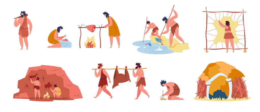 كان الإنسان قبل العصر الحجري يقتات على النباتات وجيف الحيوانات التي تخلِّفها الحيوانات المفترسة، إلى أن تعلَّم مهارات الصيد تدريجيًا فأصبح هو “المفترس”، وكان اعتماده الكبير في غذائه على اللحوم النيئة بحالتها الخام. آنذاك، كانت الأولوية العظمى هي حماية النفس. وتُشير النظريات إلى أن البشر القُدامى كانوا ينامون في الكهوف وفوق أغصان الشجر ليلًا خشيةً الحيوانات المفترسة، وكانوا يخافون من النيران التي تشتعل في الغابات بفعل الصواعق ويهربون منها بعيدًا كبقية الحيوانات.