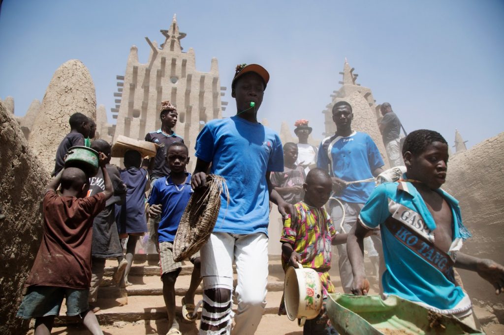 وتحت إشراف ما يقارب 80 بنَّاءً محترفاً كان الشباب يتسلَّقون واجهة المسجد ويعملون على كساء الجدران بطبقات سميكة من الطين وصيانة الأنابيب والسلالم المصنوعة من النخيل، وكان العمل ينقسم إلى أجزاء، تتولى كلَّ جزء من الجامع فرقةٌ من الفرق المتنافسة، حيث تتسلَّم الفرقة التي تنهي العمل أولاً جائزة مالية سخية تعادل نحو 68.5 جنيه إسترليني، وهو مبلغ كبير في بلدة يبلغ دخل الفرد فيها أقل من جنيه إسترليني واحد في اليوم.
