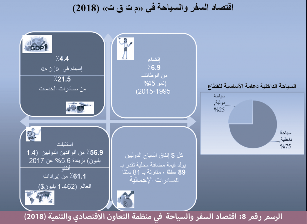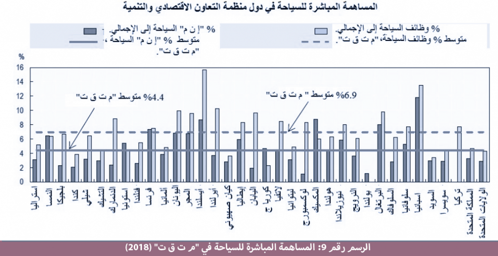 وفي دول منظمة التعاون الاقتصادي والتنمية (OECD)، يسهم قطاع السياحة إسهاماً مباشراً بنسبة %4.4 في إجمالي الناتج المحلي، و%6.9 من العمالة و%21.5 من صادرات الخدمات عام 2018م. وكل دولار يُنفقه السياح الدوليون في المتوسط يولد قيمة مضافة محلية تقدر بـ89 سنتاً، مقارنةً بـ81 سنتاً للصادرات الإجمالية . وتجاوز نماء السياحة المتوسط العالمي منذ 2014م، بعد مرحلة من النماء المُطّرد في السنوات الأخيرة. وبالنسبة إلى المستوى العالمي، يفد دول (OECD) أكثر من نصف السياحة (%56.9)، وهي تحقق %61.1 من الإيرادات. وبالإضافة إلى فوائد السياحة الدولية، تُشكّل السياحة الداخلية دعامة أساسية في معظم دول (OECD) المسؤولة عن %75 من الإنفاق السياحي، وكانت أزمة الوباء وراء تسريع تحوُّل صناعة السياحة بتغيير سلسلة القيمة والعلاقة مع المسافر، واستخدام الرقمنة عاملاً ميسّراً.