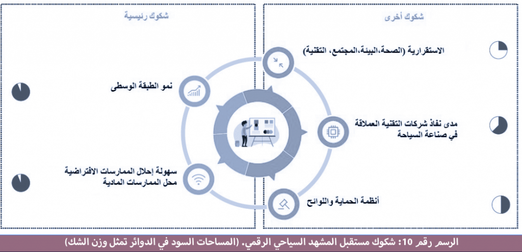 ولكن تواجه الحكومات حالياً قضايا مهمّة لتغيير ديناميّات صناعة السياحة وتوسّعها وتعافيها في المستقبل، مثل: نماء الطبقة الوسطى وتبنّي التقنية والتحوُّل الرقمي ونفاذ الشركات العملاقة في السوق. ويُشكل نماء الطبقة الوسطى وتبني التقنية عاملين رئيسين يجعلان مستقبل المشهد السياحي الرقمي المنشود فيه شك.