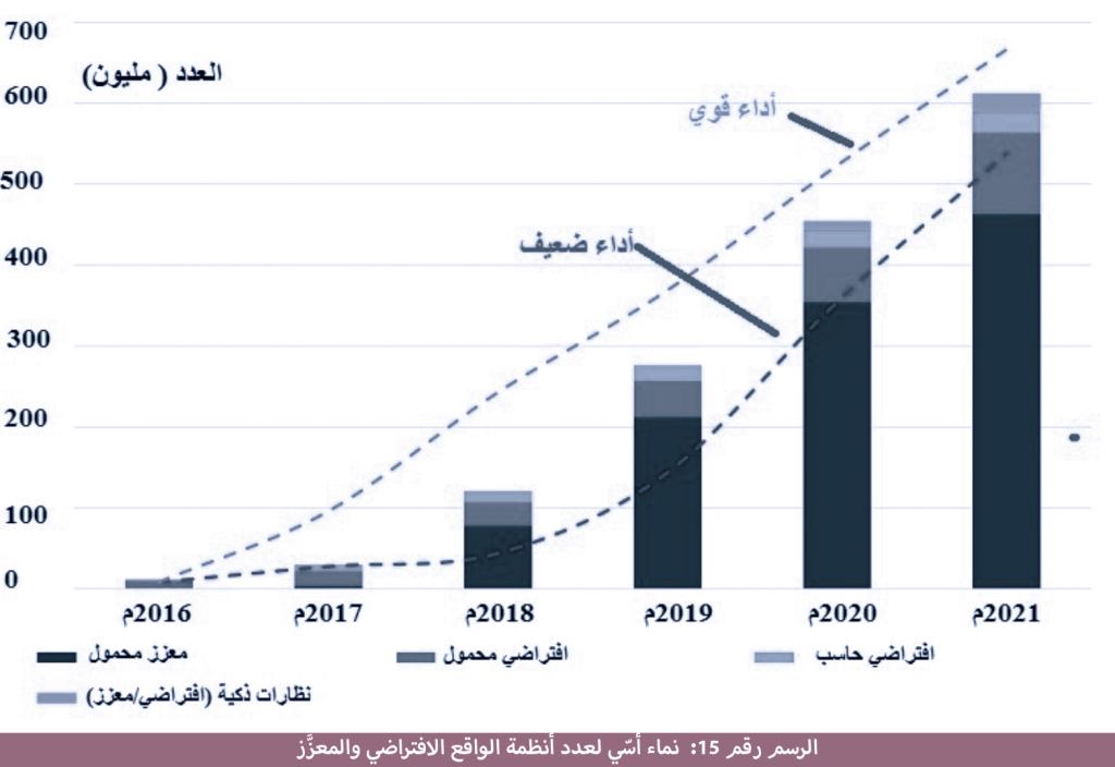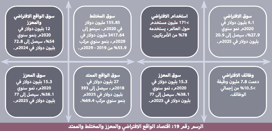 أما الواقع المعزَّز، فجاوزت قيمة سوقه 15.3 بليون دولار في 2020م مع نماء سنوي بنسبة %38.1، لتصل القيمة إلى 77 بليون دولار بحلول 2025م. وفي 2020م بلغت قيمة سوق الواقعَين المعزَّز [والممتدّ؟] الافتراضي مجتمعين 12 بليون دولار، مع نماء سنوي نسبته %54، ليصل إلى 72.8 بليون دولار في 2024م. وكانت قيمة سوق الواقع المختلط 155.85 مليون دولار في 2020م، وستنمو إلى 3417.64 مليون دولار في 2029م بنسبة نماء سنوية تبلغ %53.9 خلال 2019 – 2029م. وبلغت قيمة سوق الواقع الممتد 27 بليون دولار عام 2018م؛ وستنمو القيمة إلى 393 بليون دولار بحلول 2025م بنسبة نماء سنوي مركب تبلغ %69.4.