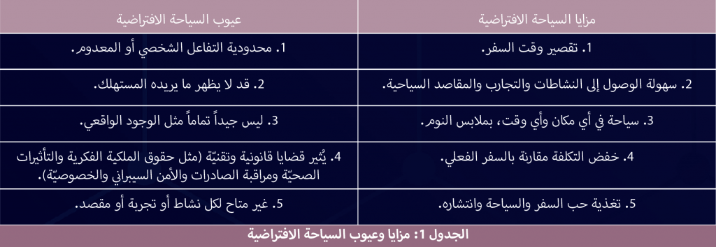 ولكن ما زالت صناعة السياحة في مرحلة تجريبيّة مع أشكال بسيطة من التطبيقات الافتراضيّة لما هو ممكن تقنياً. وحديثاً، بيّنت نتائج مقابلات، تحسُّن الإقبال على الشراء ومعدَّلات دوران العملاء وتسريع اتخاذ القرار، المدعومين بتبني الواقع الافتراضي. ويُعزَى هذا إلى شعور المستهلك بالوجود وقبوله التقنية. وعلى الرغم من مزايا السياحة الافتراضية فإن لها عيوباً من ناحية أخرى.