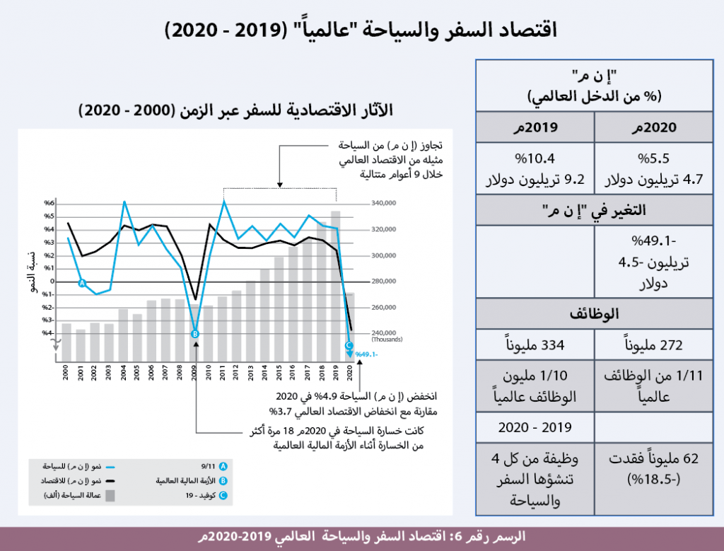 على الصعيد العالمي، تواصل السياحة تَصَدُّر توقعات النماء العالمي على المدى الطويل، مع دخل كبير يبلغ 1.5 بليون دولار من السياح الدوليّين في 2019م. وكان قطاع السفر والسياحة أحد أكبر قطاعات الاقتصاد في العالم إذ شكّل %10.4 من مجمل الناتج المحلي العالمي (9.2 تريليونات دولار)، ويشغِّل %10.6 من جميع الوظائف (334 مليوناً)، وعُزي إليه استحداث 1 من كل 4 وظائف جديدة. وشكّل إنفاق الزوار الدوليّين %27.4 من صادرات الخدمات العالميّة (1.7 تريليون دولار). لكن نتيجة الوباء، تكبد القطاع خسائر بلغت نحو 4.5 تريليونات دولار، مع انخفاض إسهامه %49.1 في إجمالي الناتج المحلي، مقارنة بعام 2019م ليصل ناتجه المجمل إلى 4.7 تريليونات دولار؛ وانخفض إنفاق الزوار المحليّين %45 والدوليّين %69.4.