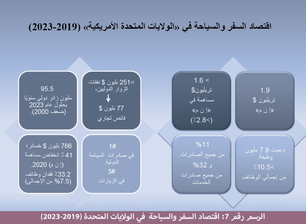 وتتصدر الولايات المتحدة العالم في صادرات السفر والسياحة الدولية وتحتل المرتبة الثالثة من حيث مجمل عدد الزيارات السياحيّة. ففي 2019م، حقق قطاع السفر والسياحة إجمالي ناتج محلي بنحو 1.9 تريليون دولار. وأسهمت صناعة السياحة بأكثر من 1.6 تريليون دولار في الناتج الاقتصادي عام 2017م، أي %2.8 من إجمالي الناتج المحلي، ودعمت السياحة أكثر من 16.5 مليون وظيفة (%10.5 من مجموع التوظيف). وشكّلت صادرات السياحة %11 من جميع الصادرات، ونحو %32 من صادرات الخدمات. وجاوزت نفقات الزوار الدوليّين 251 بليون دولار، مما أسفر عن فائض تجاري قيمته 77 بليون دولار. وستستقبل الولايات المتحدة 95.5 مليون زائر دولي سنوياً بحلول عام 2023م (أي ضعف ما كان عام 2000م). ولكن بتأثير الوباء، تكبّد قطاع السفر والسياحة خسارة 766 بليون دولار عام 2020م، وانخفاضاً %41 في مساهمة القطاع في إجمالي الناتج المحلي؛ وانخفضت وظائف السفر والسياحة %33.2 (%7.5 من إجمالي التوظيف).