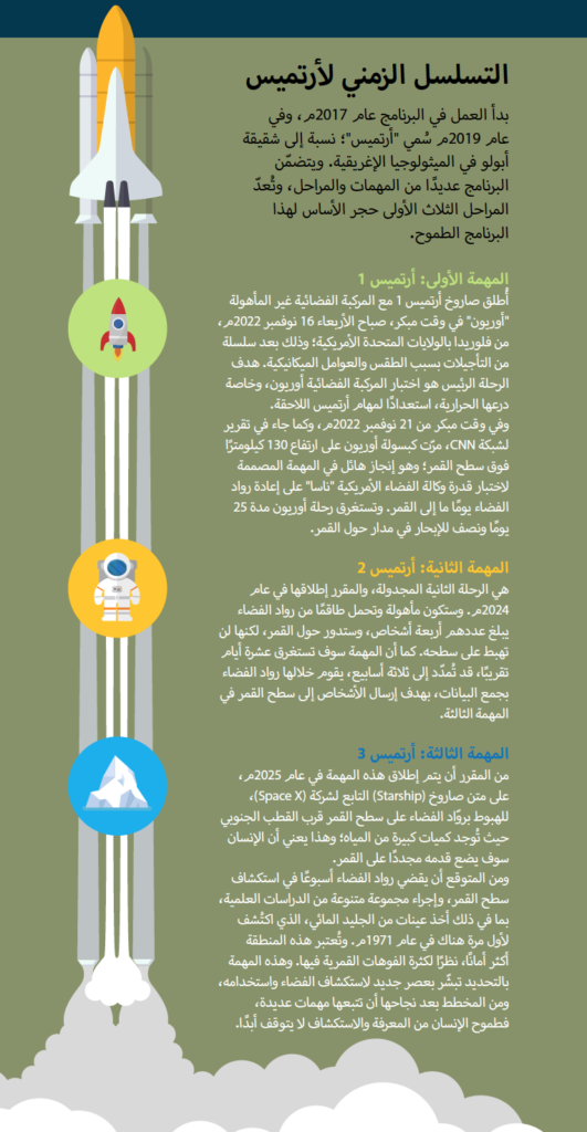 بعد انقطاع دام حوالي خمسين سنة، منذ أن وطأت قدم الإنسان سطح القمر على متن آخر رحلة فضائية لزيارته ضمن برنامج أبولو في ديسمبر 1972م، يُعيد برنامج “أرتميس” الإنسان إليه بأهداف طموحة، حيث أعلنت وكالة الفضاء الأمريكية “ناسا”، في 25 يوليو 2019م، أن البرنامج يسعى للاكتشاف العلمي والتنمية الاقتصادية؛ والغاية هي إنشاء أول وجود بشري-روبوتي طويل المدى على القمر.