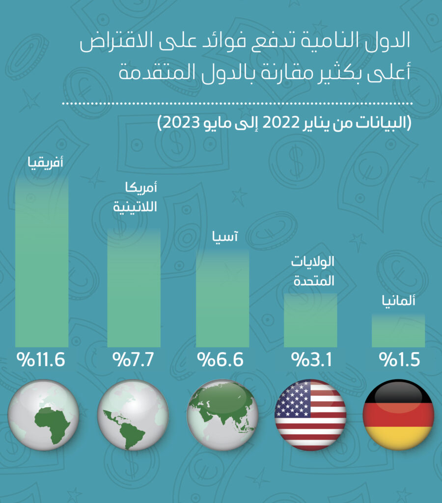 المشكلة الكبرى ليست عندما تقترض الدول المتقدمة ويزيد دينها على ناتجها المحلي الإجمالي كما هو الحال مع الولايات المتحدة الأمريكية والصين واليابان وغيرها من الدول الصناعية الكبرى. فهذه الدول وخصوصًا الصين هي مصنع العالم، وعندما تقترض توجه الأموال نحو الاستثمار بشكل رئيس؛ بل إنها تقترض بنسب فوائد متدنية. المشكلة في الدول النامية الهشة والفقيرة التي تخضع لشروط قاسية منها معدل الفوائد العالية على الدين. فالدول الإفريقية الفقيرة تدفع معدلات فائدة أعلى بأربع مرات مقارنة بالولايات المتحدة، وثماني مرات مقارنة بألمانيا، كما يشير الرسم البياني.