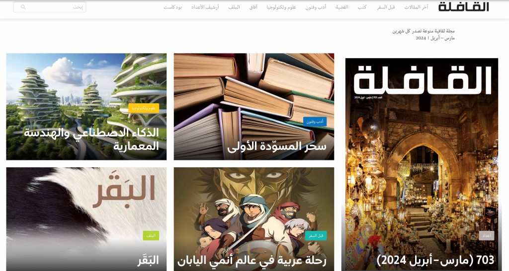 Al-Qafilah magazine is one of the Arab world’s best-known cultural magazines. It has been published in Arabic by Aramco since 1953, featuring more than 700 editions today. The bimonthly publication features cultural stories in literature, arts, science and technology, as well as in general life-related topics. It is available on the internet, and is distributed to subscribers in the Kingdom and around the world.