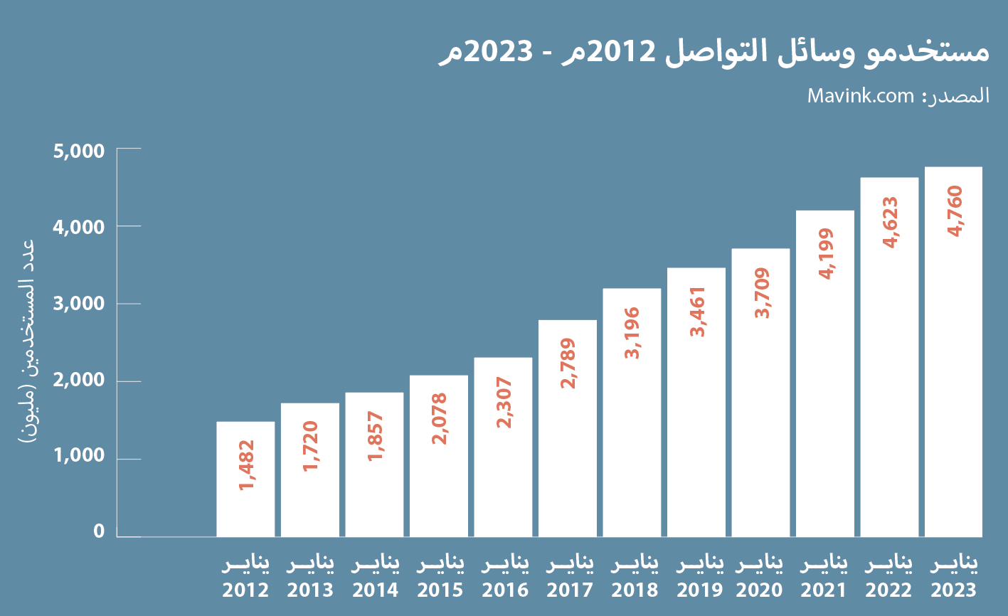 وتُعدُّ وسائل التواصل الاجتماعي المكان المُفضَّل لمستخدمي الإنترنت في العالم. فقد شهد عدد مستخدمي هذه الوسائل نموًا هائلًا؛ إذ ارتفع من 1.43 مليار مستخدم عام 2012م إلى 4.76 مليارات مستخدم حول العالم في شهر أبريل من عام 2023م.